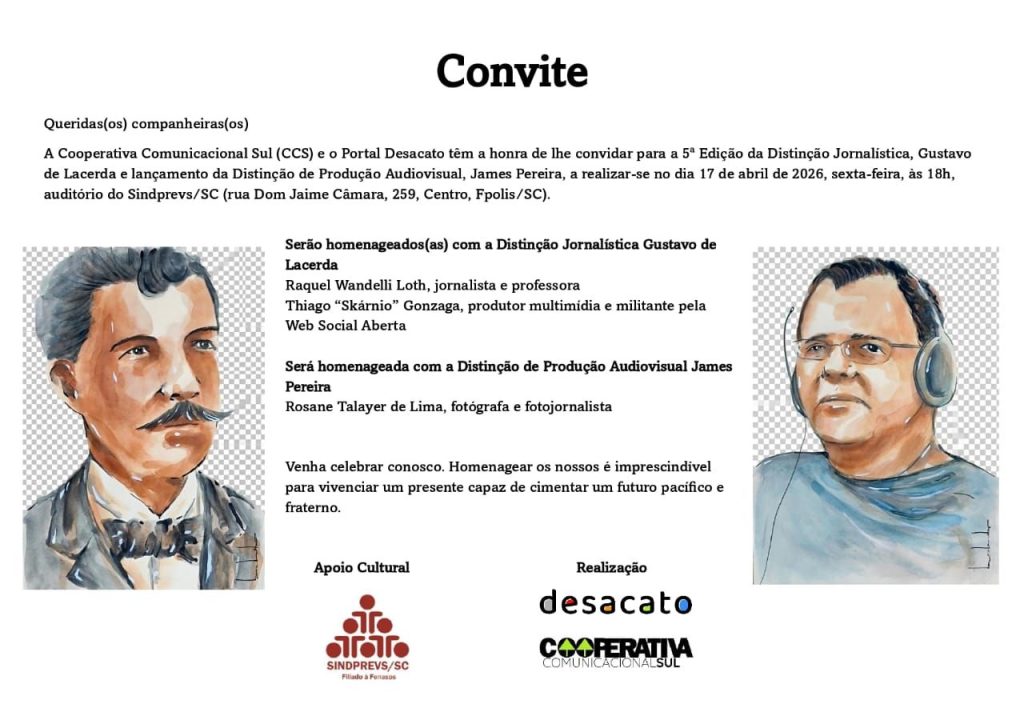 DISTINÇÃO GUSTAVO LACERDA – Todos os anos o Portal Desacato homenageia profissionais da comunicação com a distinção que leva o nome do jornalista catarinense, criador da Associação Brasileira de Imprensa, Gustavo Lacerda. A ideia é justamente reverenciar aqueles e aquelas que contribuíram ou contribuem para uma comunicação livre, soberana, a partir da mirada dos trabalhadores. Já tive a honra de receber esse carinho. Para este ano de 2026 dois novos nomes foram escolhidos. Profissionais por quem nutro profundo respeito e admiração: Raquel Wandelli e Thiago Skárnio.